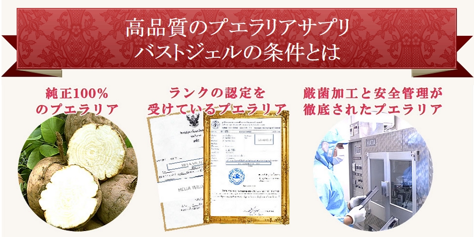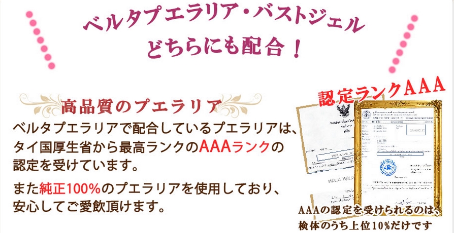 またFDA(タイ国厚生省食品医薬品局)認可がおり、プエラリアの中でも更に高品質の証拠であるAAA(トリプルA)ランクのプエラリアのみを使用しております。